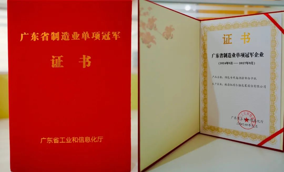 近日,广东省工信厅组织开展了制造业单项冠军企业评选工作。广东冠豪高新技术股份有限公司旗下高端包装纸业版块的核心平台——珠海红塔仁恒包装股份有限公司(简称“红塔仁恒”)凭借“烟包专用高档涂布白卡纸”的行业领先技术实力与持续创新能力,获得“广东省制造业单项冠军”企业称号。
