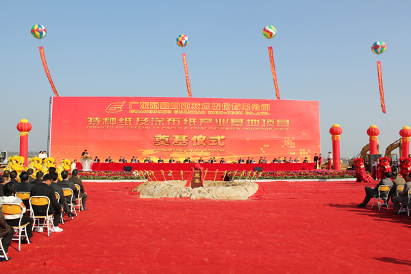2010年12月28日上午,湛江经济技术开发区东海岛新区晴空万里,凉风怡人,彩旗飘扬,鼓乐齐鸣,冠豪高新在此隆重举行特种纸及涂布纸产业基地项目奠基仪式。湛江市委、市政府、开发区领导、各界友人以及冠豪公司员工近500人共聚一堂,共同见证冠豪高新具有历史性意义的一刻。