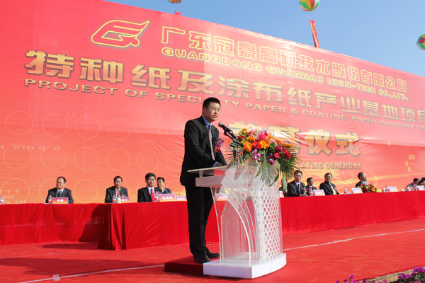 在奠基仪式上,中国纸业投资总公司总经理、冠豪高新董事长童来明,开发区党委书记、管委会主任陈吴,湛江市副市长陈岸明分别致辞,陈岸明副市长指出,冠豪高新迁址东海岛,这既是公司发展的需要,也符合湛江市的城市发展规划和产业布局规划,将对湛江市建设中央商务区和经济发展产生强大的推动力和示范、带动作用。