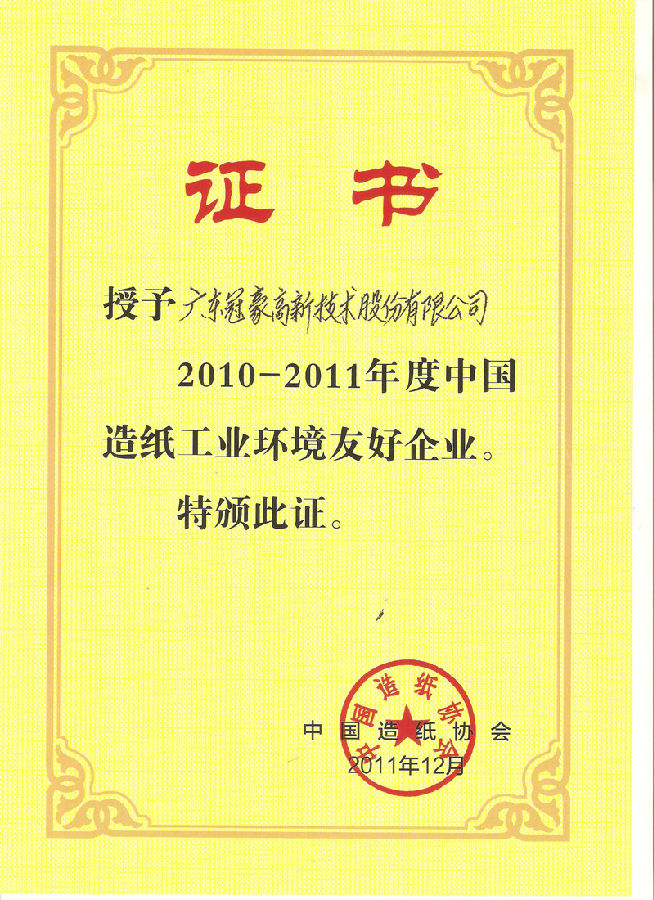经过组委会审定,并经网上公示,中国造纸协会授予冠豪高新、红塔仁恒、玖龙纸业、山东晨鸣等31家企业为2010-2011年度“中国造纸工业环境友好企业”的单位并予以表彰,颁发奖牌和证书。