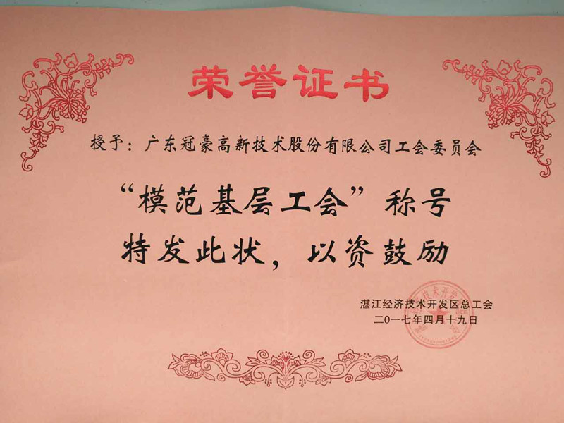 近日,从湛江开发区总工会传来喜讯,经过各基层工会推荐,湛江开发区总工会评选,冠豪高新工会获评2015-2016年度湛江开发区“模范基层工会”荣誉称号。