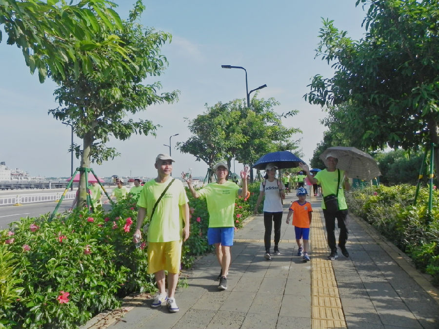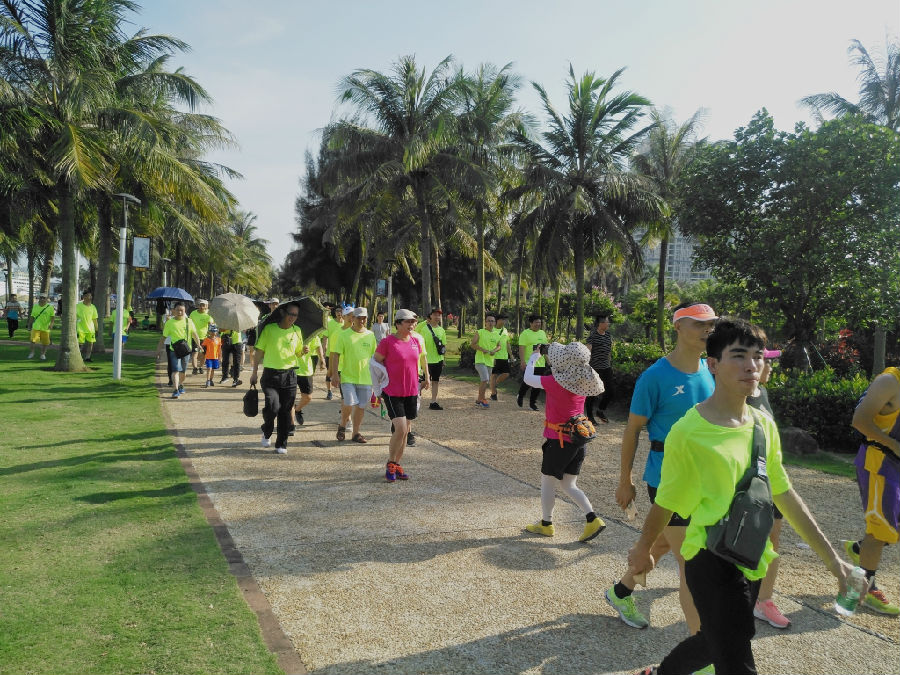 当天下午五点,活动正式开始。盛夏的傍晚,太阳依然火辣辣的,但大家的兴致很高,头顶烈日,你追我赶地往前奔走,一路上领略了港城傍晚旖旎的城市美景。他们有的是夫妻档、有的是父子档,还有全家齐上阵的,大家卯足一股劲,大步流星地向前走。有的刚参加完公司羽毛球选拔赛,接着又参加20公里夜徒步活动,有的队员不慎崴到脚也不愿坐徒步俱乐部事先安排的车辆,相互鼓励、相互支持,坚持走全程。