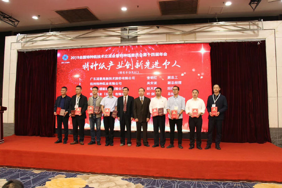 10月15日,全国特种纸技术交流会暨特种纸委员会第十四届年会开幕式举行了“特种纸产业创新先进表彰仪式”,中轻集团党委副书记、总经理郭建全,副总经理任建平,衢州市副市长王良春等政企领导受邀出席。活动重点表彰了冠豪高新等一批为我国特种纸产业创新作出突出贡献的骨干企业。奎明红副总工程师以其在无碳复写纸、热敏纸和热转印纸等产品领域作出的独特贡献获评“特种纸产业创新先进个人”。