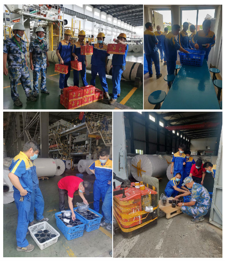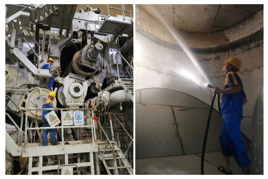 6月5日11时47分,2#纸机停机检修作业正式拉开序幕。伴随着纸机设备轰鸣声的平息,抢修作业现场的吆喝声渐起。没有振奋人心的思想动员,凭着一身扎实的业务功底与必胜的信念,每一位参与抢修的员工都严格按照原定工作计划有条不紊的忙活开来。在纸机二楼,生产人员为了不影响设备检修人员的中心辊更换作业,他们避开了作业区,分批开展设备清洗作业:干燥部的人员负责清洗导辊黏料与机架纸毛,确保气罩卫生整洁。施胶人员一边负责更换上下辊,一边组织进行施胶机地沟新加振动筛的电焊作业……纸机一楼则尽是穿梭在槽罐里清洗槽罐积浆的生产人员忙碌的身影,透过他们严肃的脸颊和浑身湿透的工作服,只见浆罐内部正逐渐显现出其原本“容颜”。至6月5日16时,检修常规作业按时完成,检修抢得“开门红”。
