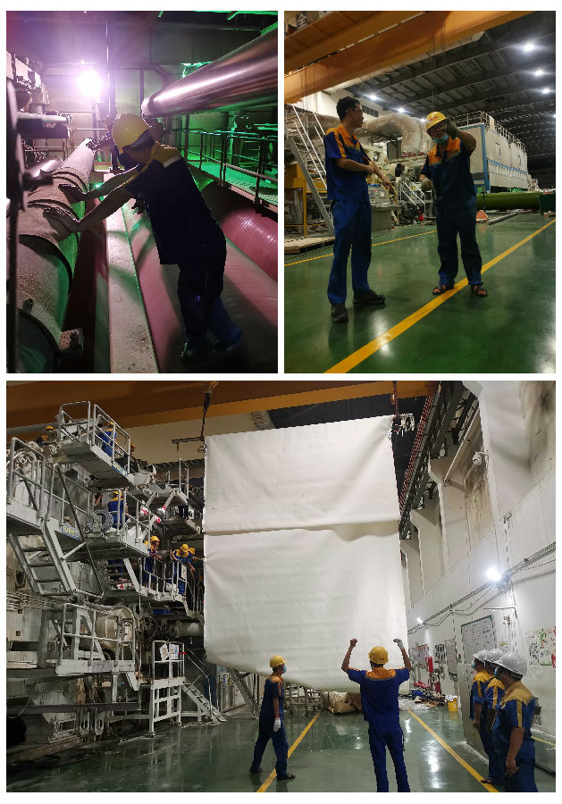6月6日20时,经过近2天的紧张抢修,疲惫写在了每位检修人员的脸上,但此时任务还未完成,容不得半点松懈。短暂的喘息之后,大家又义无反顾地投身到接下来的“战斗”中去,现场再次响起了一阵又一阵“1、2、3”发力的呐喊……时间飞速流逝,检修人员的好消息也接踵而至:纸机一二三毛布完成更换,中心辊、靴辊全部复位,成型网完成更换,开机前复位、检查完成……至6月7日早上8时30分,随着2#纸机的轰鸣声再次响起,一张张布满污渍的面孔终于绽放出喜悦的笑容!比原定检修计划提前1天完成,这场纸机检修“遭遇战”,我们取得了圆满胜利!