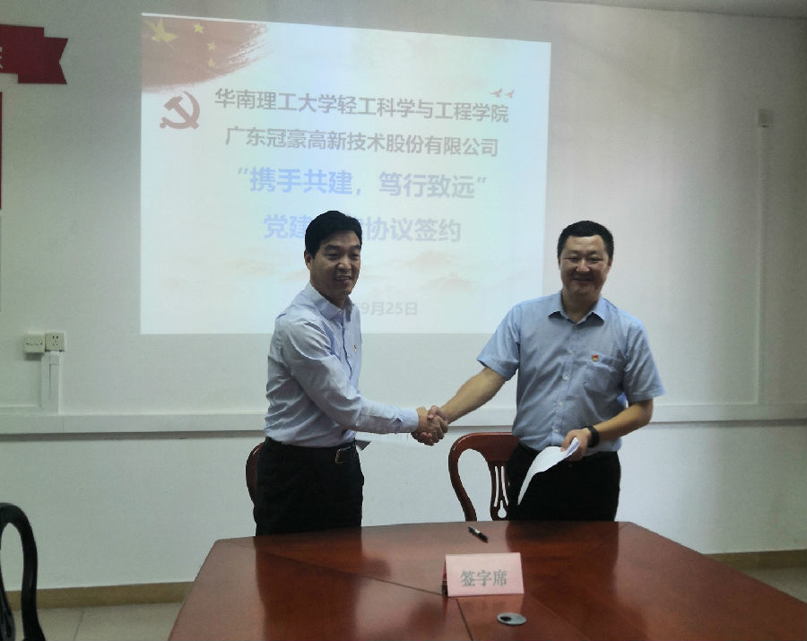 2020年9月25日,广东冠豪高新技术股份有限公司党委与华南理工大学轻工科学与工程学院党委在轻工学院办公楼联合举办了“携手共建 笃行致远”的主题共建活动,冠豪高新党委副书记、纪委书记李海滨代表公司党委与轻工学院党委书记张建功现场签订了党建共建协议。