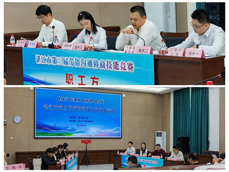 本次竞赛由湛江总工会主办,湛江市10个县(市、区)总工会共10支队伍参加本次集体协商技能竞赛,旨在建立新就业形态劳动者权益协商协调机制,推进集体沟通协商常态化、规范化,切实维护职工劳动经济权益,比赛分别于12日、13日分别进行了初赛和决赛。