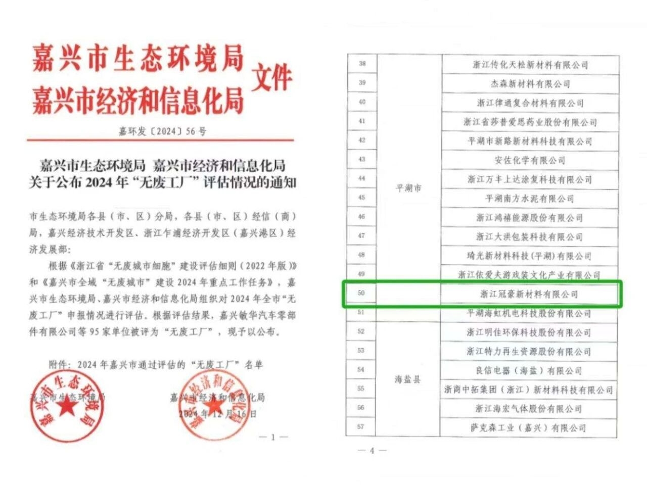 近日,嘉兴市生态环境局和经信局正式公示2024年“无废工厂”名单,冠豪高新旗下浙江冠豪凭借绿色生产体系和环保管理创新,顺利通过评审,成功获评“无废工厂”称号。
