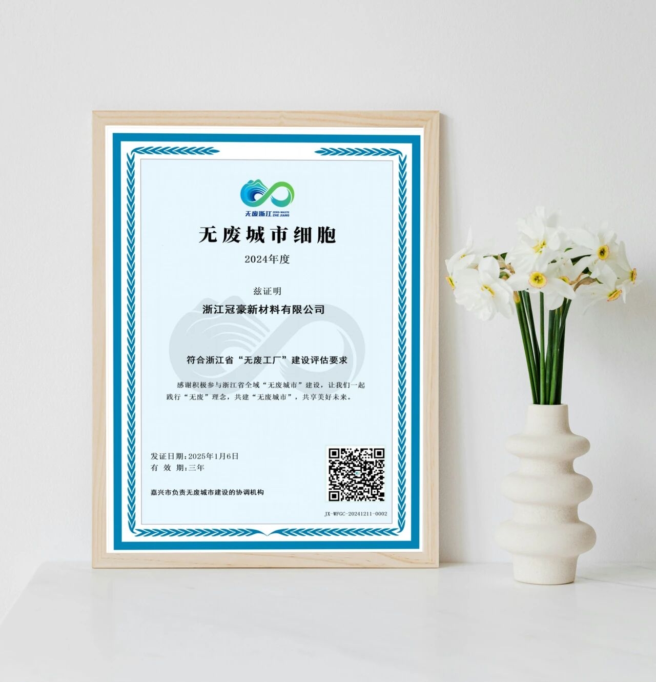 浙江冠豪始终积极响应国家及地方政策导向,坚定推进绿色低碳发展,全面落实“无废工厂”建设目标。经过不懈努力,公司成功获评2024年度“无废工厂”荣誉称号。这一认可不仅彰显了企业在环保领域的扎实实践,也进一步激励企业持续深耕绿色制造,推动可持续发展。